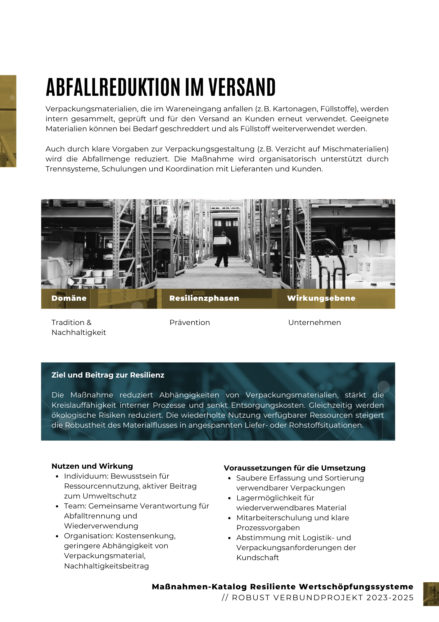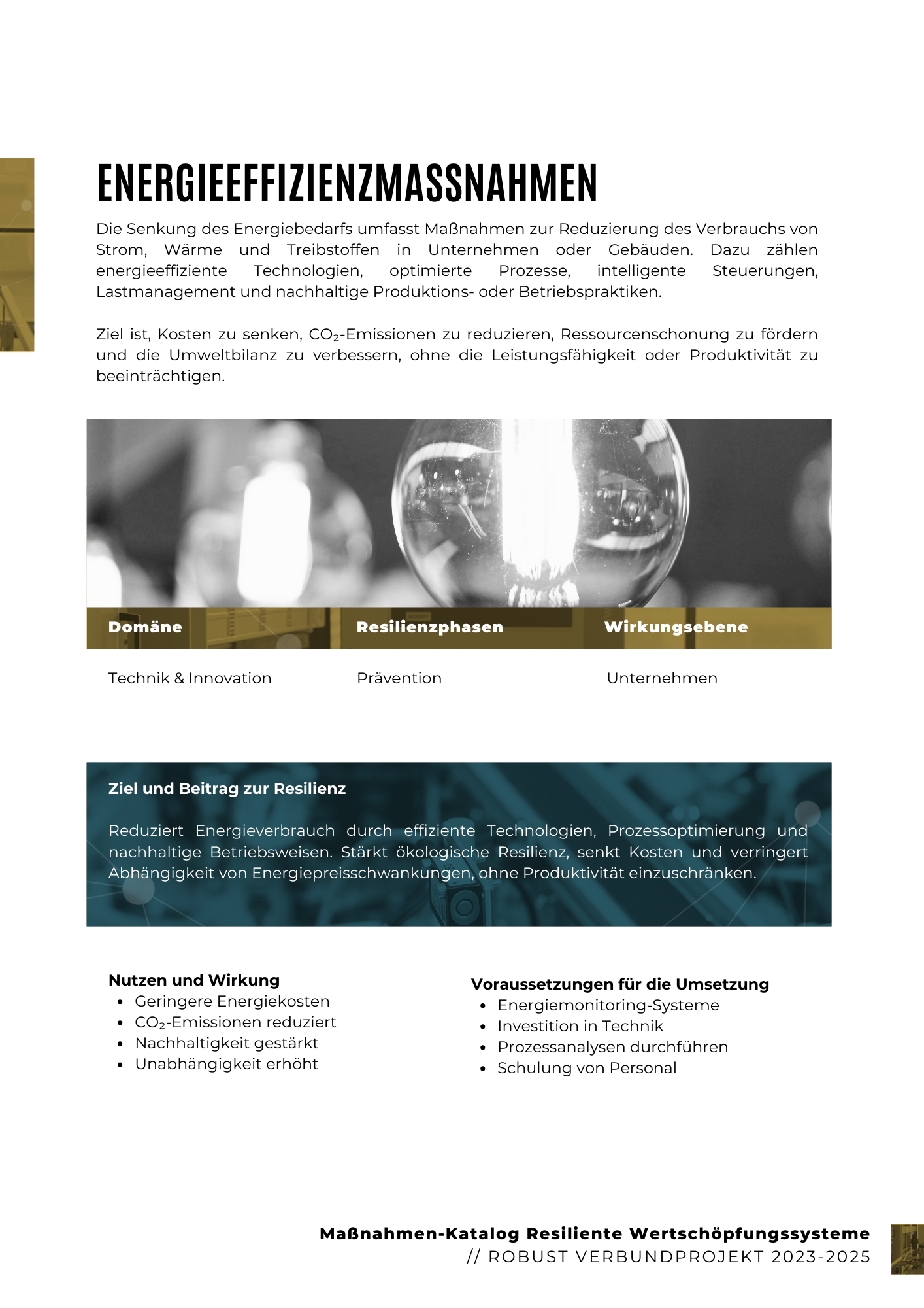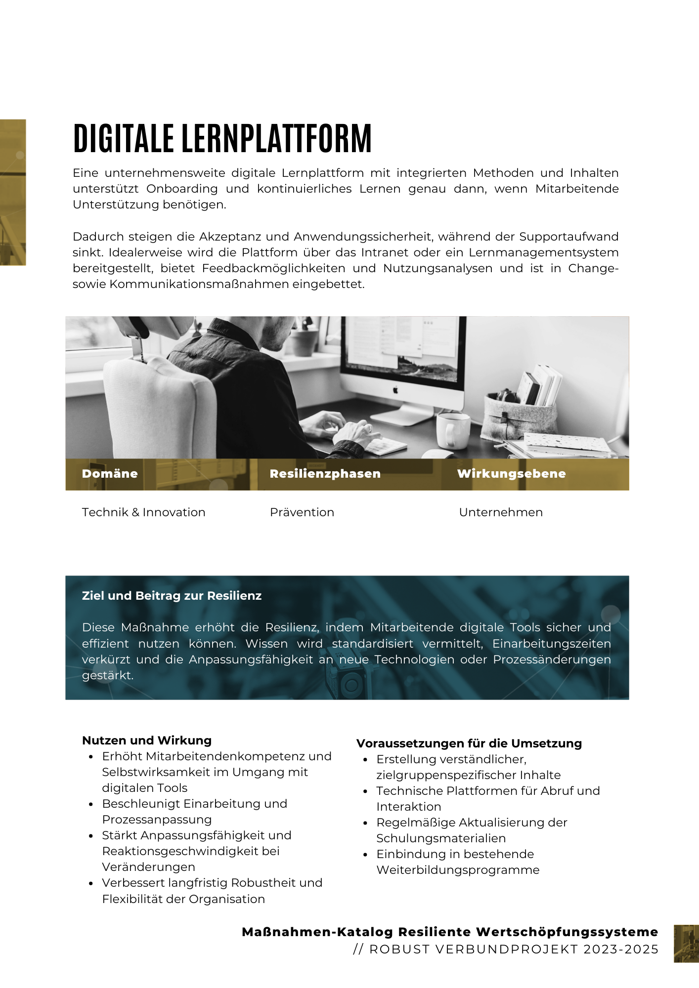 Die im Katalog enthaltenen Maßnahmen decken eine breite Palette von Themen ab, die von der Digitalisierung von Geschäftsprozessen über die Verbesserung der Kommunikations- und Kooperationsstrukturen bis hin zur Sicherstellung von Datenschutz und Informationssicherheit reichen. Jedes Maßnahmenprofil ist darauf ausgelegt, Unternehmen dabei zu unterstützen, ihre Wertschöpfungsketten robuster und widerstandsfähiger gegenüber externen Einflüssen zu gestalten und gleichzeitig die Vernetzung und Zusammenarbeit über Unternehmensgrenzen hinweg zu stärken.