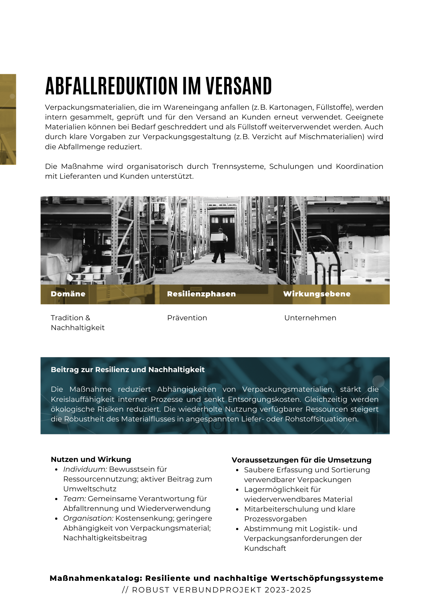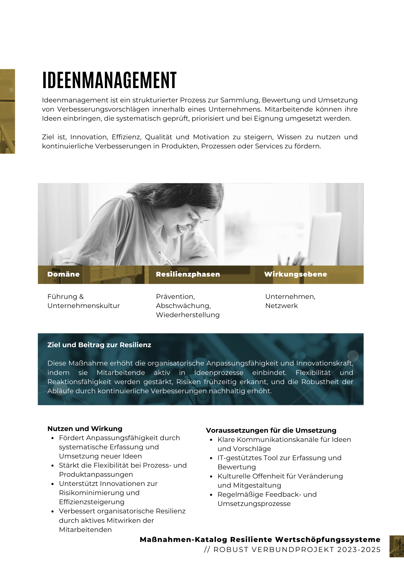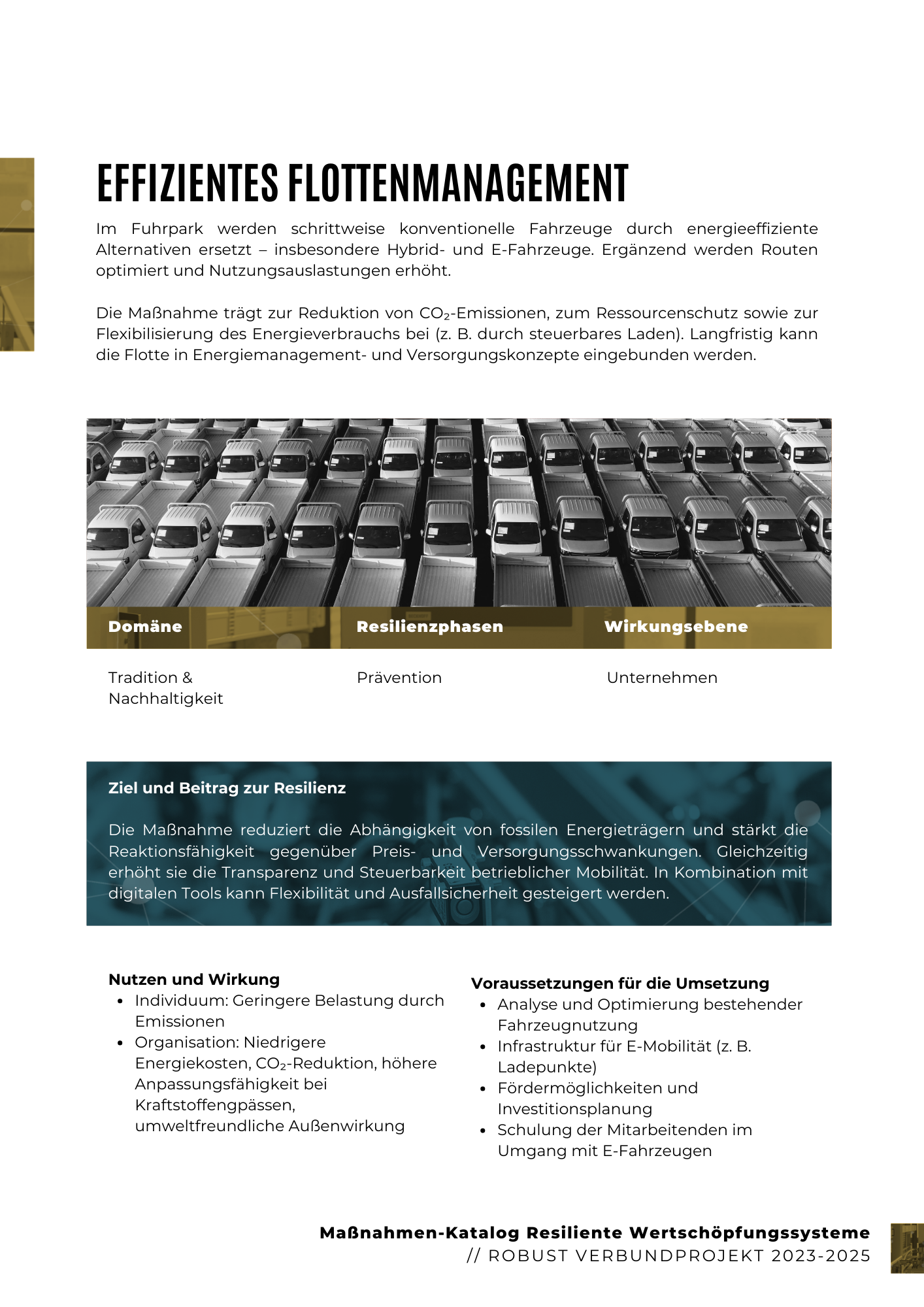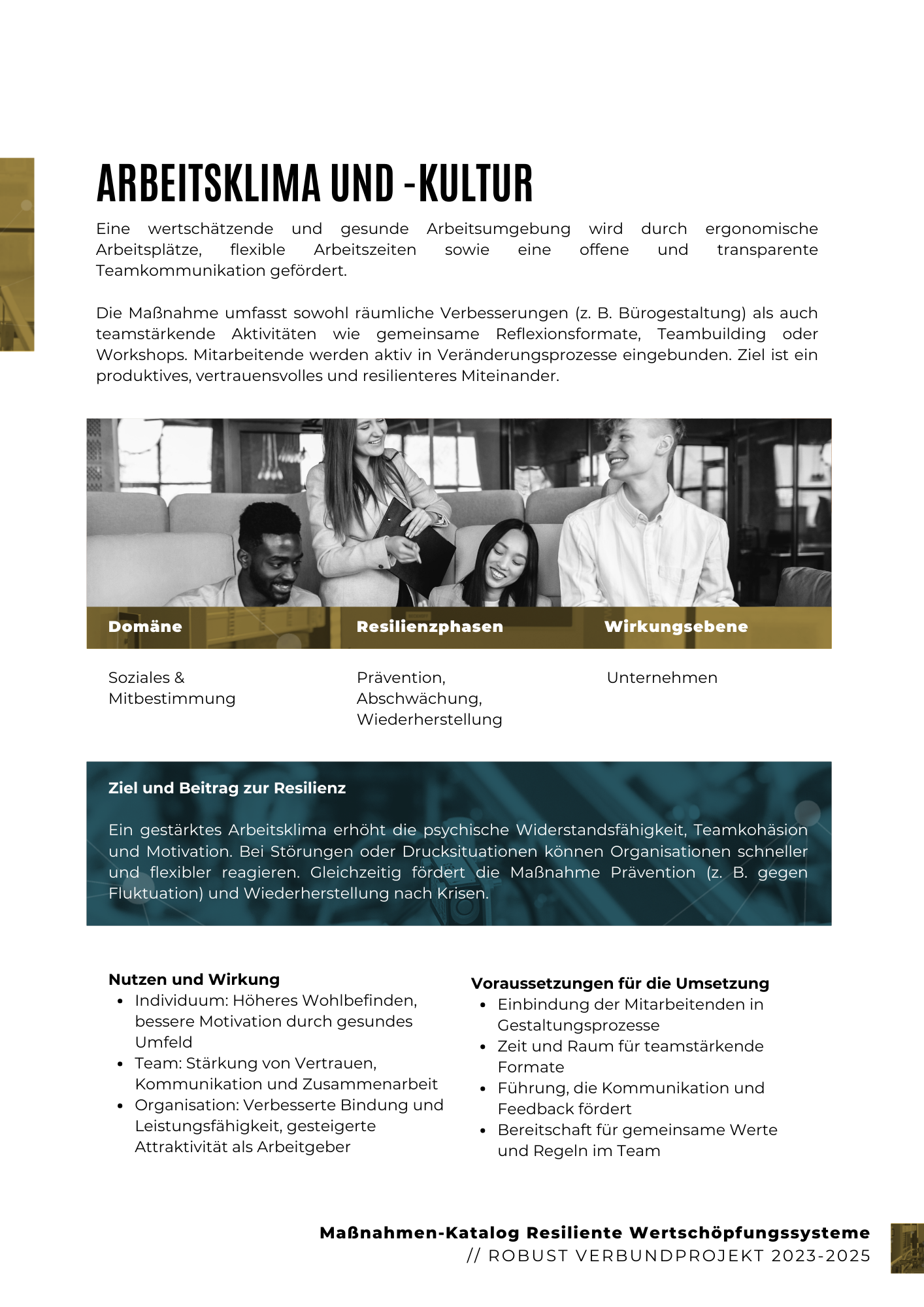 Die im Katalog enthaltenen Maßnahmen decken eine breite Palette von Themen ab, die von der Digitalisierung von Geschäftsprozessen über die Verbesserung der Kommunikations- und Kooperationsstrukturen bis hin zur Sicherstellung von Datenschutz und Informationssicherheit reichen. Jedes Maßnahmenprofil ist darauf ausgelegt, Unternehmen dabei zu unterstützen, ihre Wertschöpfungsketten robuster und widerstandsfähiger gegenüber externen Einflüssen zu gestalten und gleichzeitig die Vernetzung und Zusammenarbeit über Unternehmensgrenzen hinweg zu stärken.