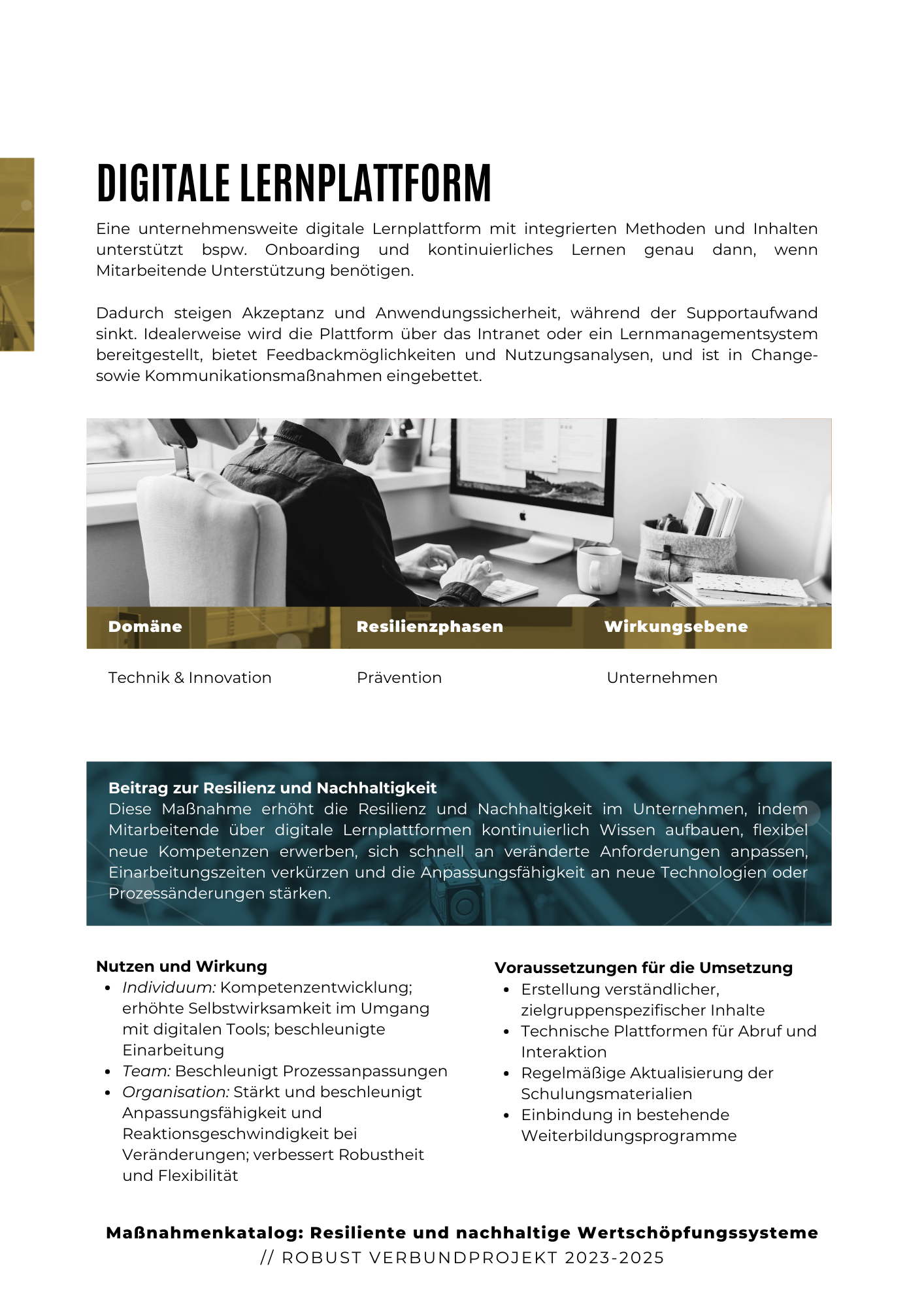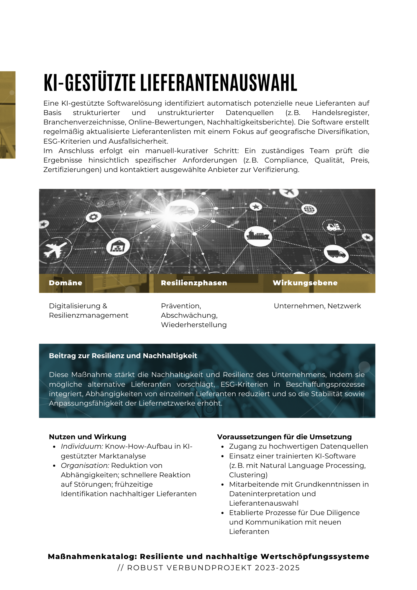 Durch die Implementierung dieser Maßnahmen können Unternehmen nicht nur ihre eigene Wettbewerbsfähigkeit steigern, sondern auch aktiv zur Schaffung nachhaltiger und zukunftsfähiger Wertschöpfungsnetzwerke beitragen. Der Katalog stellt damit einen wesentlichen Beitrag zur digitalen Transformation und zur langfristigen Sicherung wirtschaftlicher Stabilität und Innovationskraft dar.